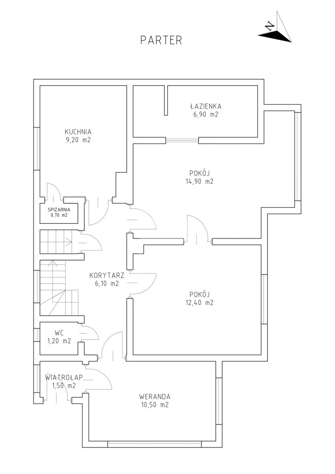 - PARTER (HŚR.= 265 cm): 2 pokoje (15 m2; 12,5 m2), kuchnia ze spiżarnią (10 m2), łazienka (7 m2), wc (1,5 m2), weranda (10,5 m2), wiatrołap (1,5 m2) i komunikacja;