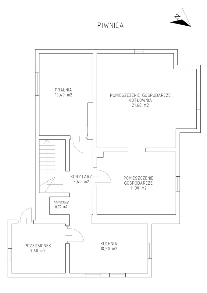 => Budynek mieszkalny wzniesiony w technologii tradycyjnej, murowanej na początku XX w., utrzymany w należytym stanie technicznym;- PIWNICA (HŚR.= 185 cm): 2 pomieszczenia gospodarcze (21,5 m2; 12 m2), kuchnia (10,5 m2), pralnia (10,5 m2), prysznic (1 m2) i komunikacja;