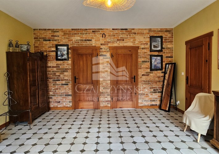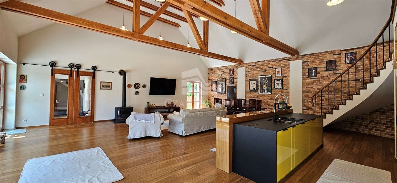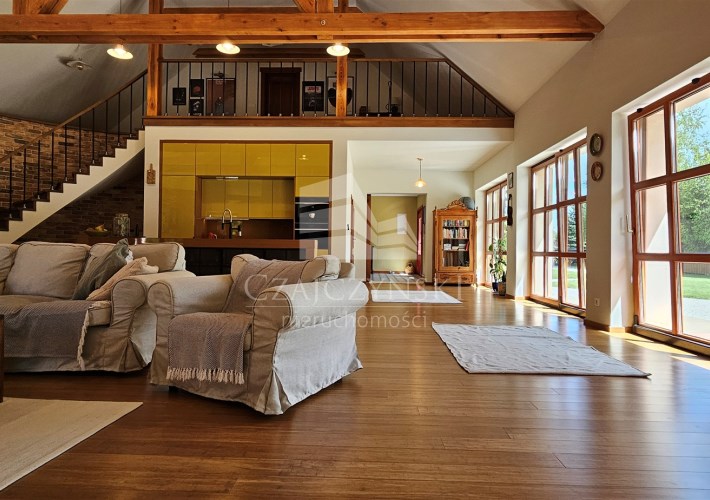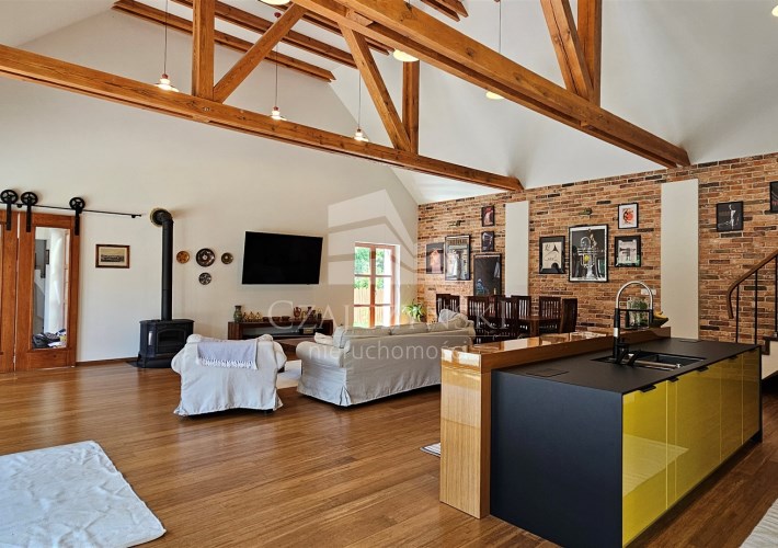Budynek główny, parterowy z poddaszem użytkowym i garażem dwustanowiskowym w bryle, o powierzchni użytkowej ok. 290 m2 oraz budynek pomocniczy o powierzchni ok. 90 m2