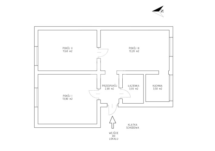 - mieszkanie o powierzchni 47,88 m2, na którą składają się: 3 pokoje, (11,60 m2 13,20m2 i 13,80 m2), widna kuchnia (3,50 m2), łazienka z wc (3,00 m2) oraz przedpokój (2,80 m2);