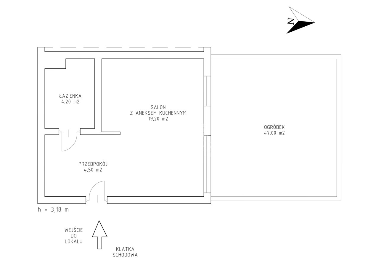 - lokal składa się z przestronnego salonu połączonego z aneksem kuchennym (19,20m2 ) z wyjściem na duży ogródek ( 47m2), łazienki z wc (4,20m2) oraz przedpokoju (4,50m2);