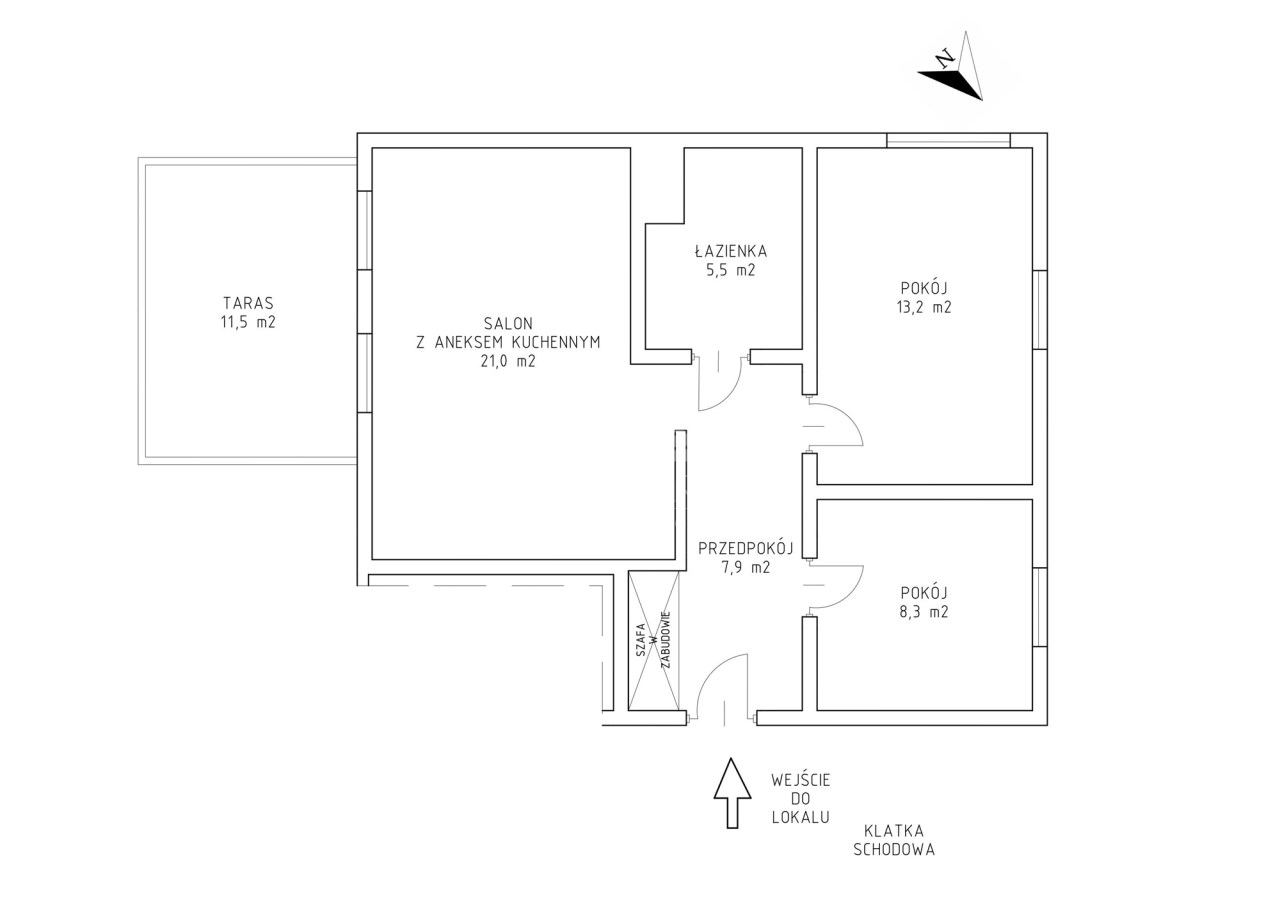 - mieszkanie o powierzchni 55,91 m2, na którą składają się: salon z aneksem kuchennym (ok. 21 m2), 2 sypialnie (13,2 m2; 8,3 m2), łazienka z wc (5,5 m2) i przedpokój (7,9 m2);